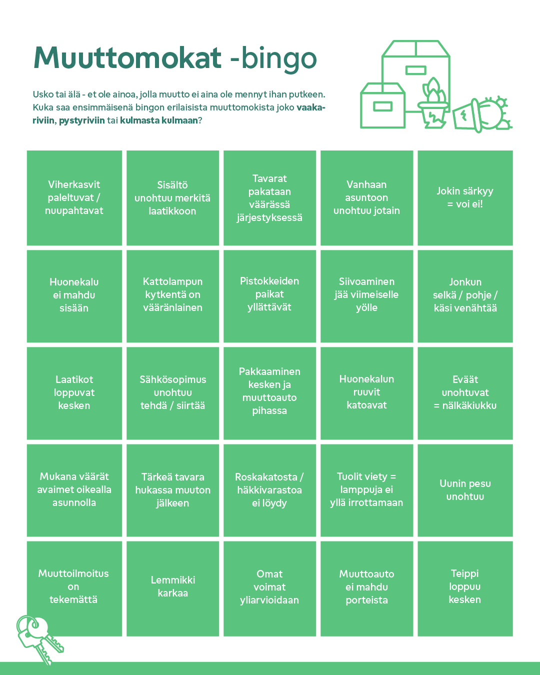 Usko tai älä - et ole ainoa, jolla muutto ei aina ole mennyt ihan putkeen. Mikäli sinulla on muutto edessä, tämän bingon avulla voit varautua mokiin – tai seurata rohkeasti kohtaloasi ja katsoa miten (ja mitä) mokia kerääntyy. Kuka saa ensimmäisenä bingon joko vaakariviin, pystyriviin tai kulmasta kulmaan?